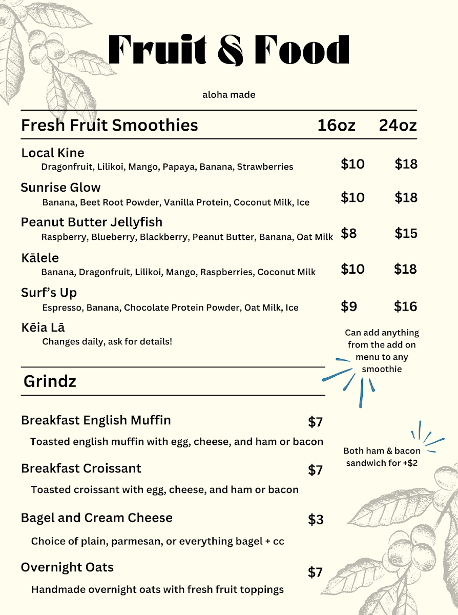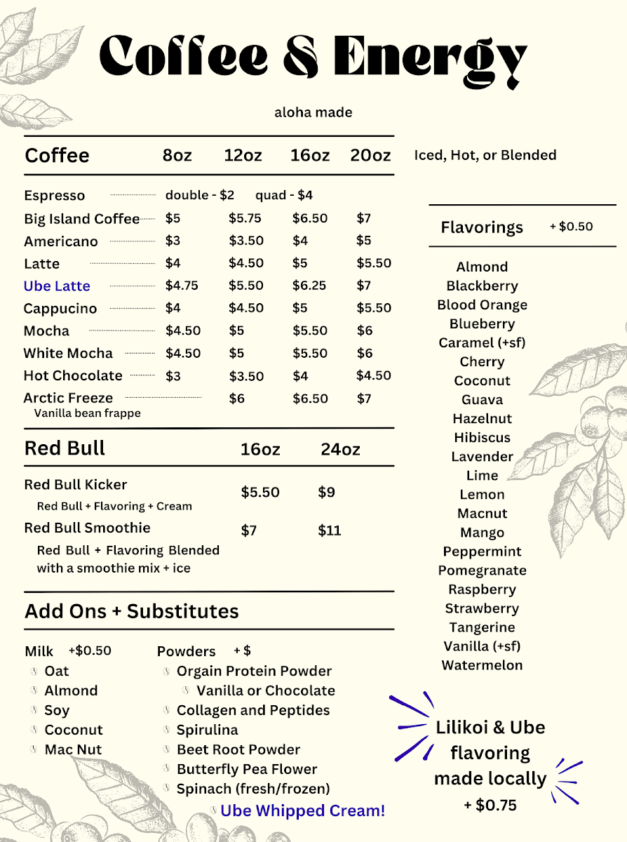 Step up to the window and be greeted by the friendly baristas who take immense pride in serving some of the best coffee on the island. The atmosphere is casual and inviting, perfect for both early risers and leisurely breakfasts. As you browse the menu, prepare to indulge your senses with their standout offerings, such as the Ube Latte topped with fresh Ube whipped cream or the refreshing Kai Uli Smoothie, brimming with seasonal fruits and creamy coconut milk.